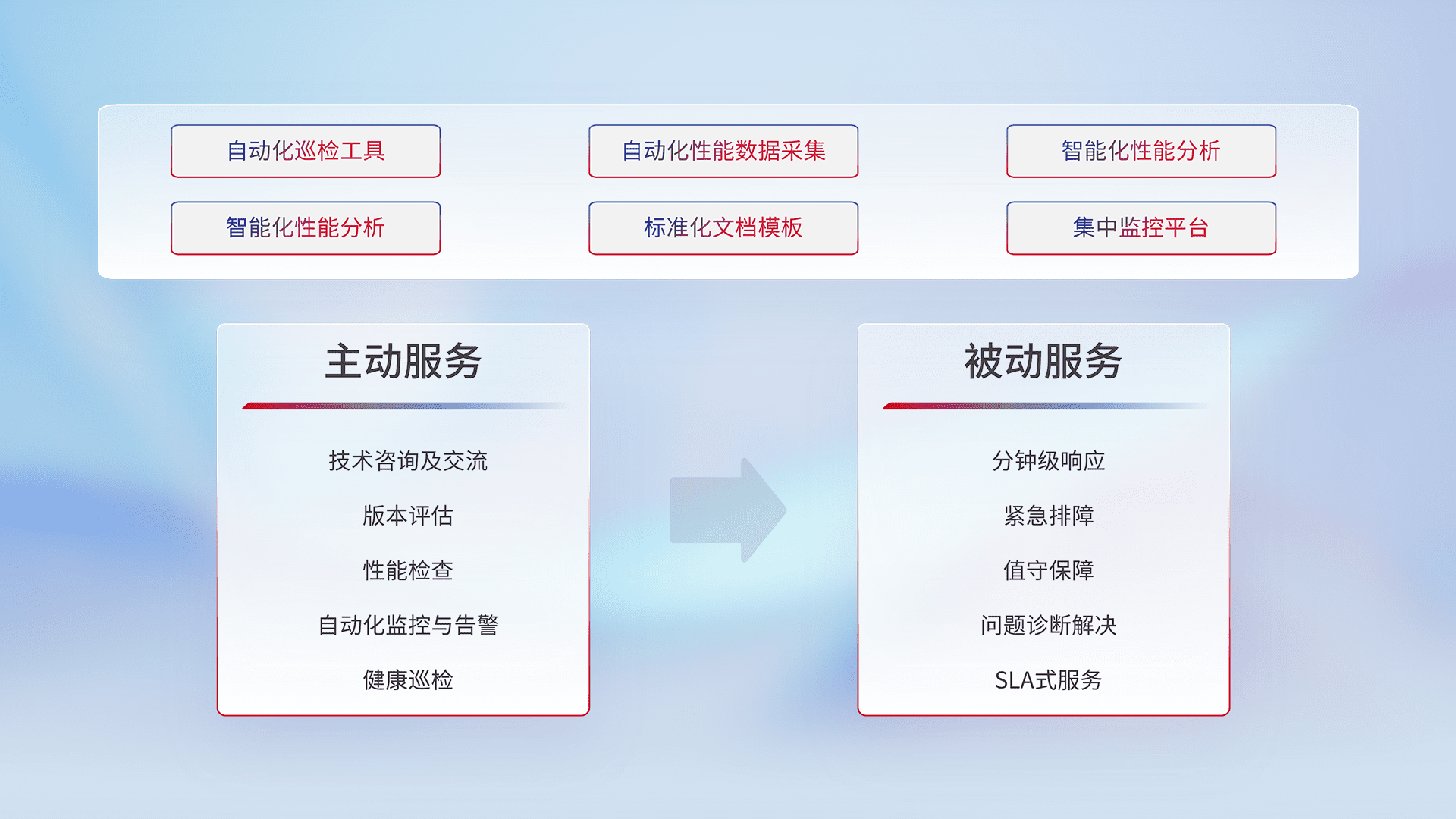 智能化工具和标准化文档,,,,保障服务质量,,,提供主动服务(包含技术咨询、、、、版本评估、、性能检查、、、、自动化监控与告警、、、、健康巡检)和被动服务包含(分钟级响应、、、、紧急排障、、、、值守保障、、、、问题诊断解决、、、、SLA服务)。。
